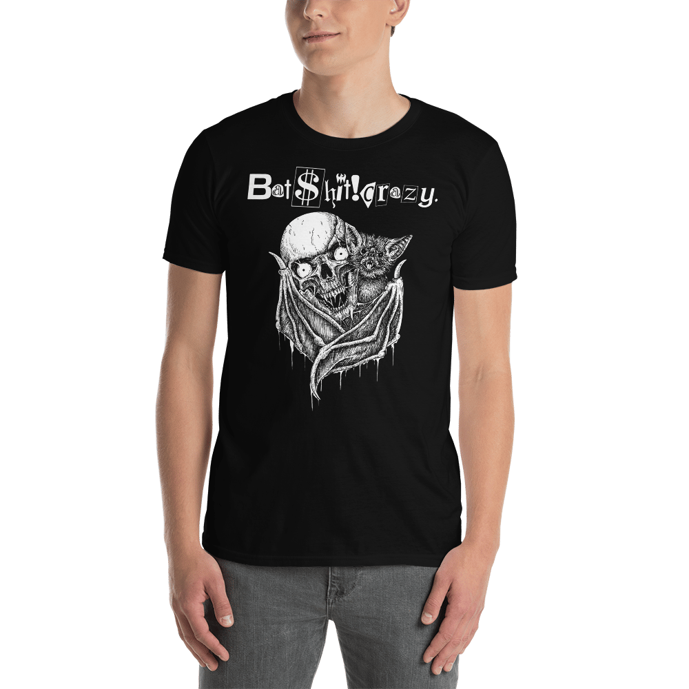 The original "Batskull" shirt. The very first design and idea that got Batshit Cazy off the ground featuring a Bat from the Belfry holding on to a Vampire skull. It's made of 100% ring-spun cotton and is soft and comfy. The double stitching on the neckline and sleeves add more durability to what is sure to be a favorite! Wear at own risk!