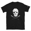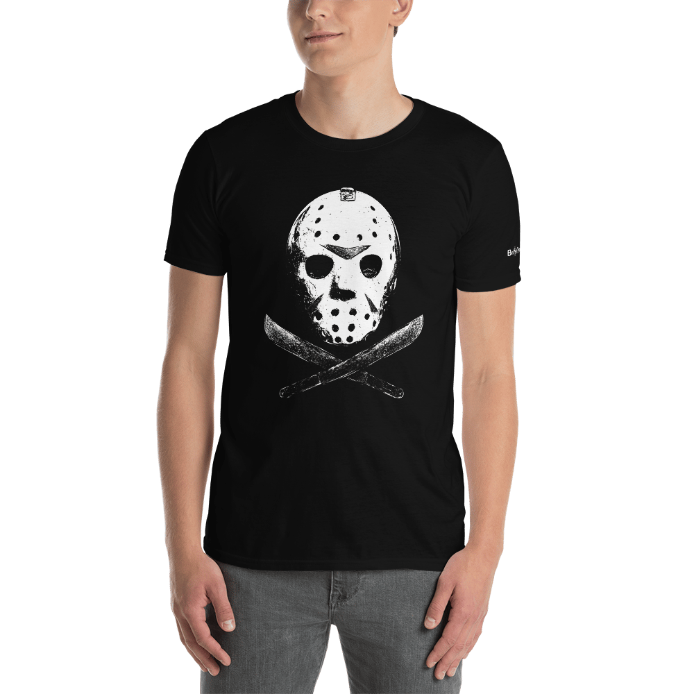 Originally titled the "Shelly Shirt", and if you know the history of this mask it would make sense. But Shelly was a wuss and you have to be tough as nails to wear this so we changed it to a more killer name....Jason! It's made of 100% ring-spun cotton and is soft and comfy. The double stitching on the neckline and sleeves add more durability to what is sure to be a favorite! Wear at own risk!
